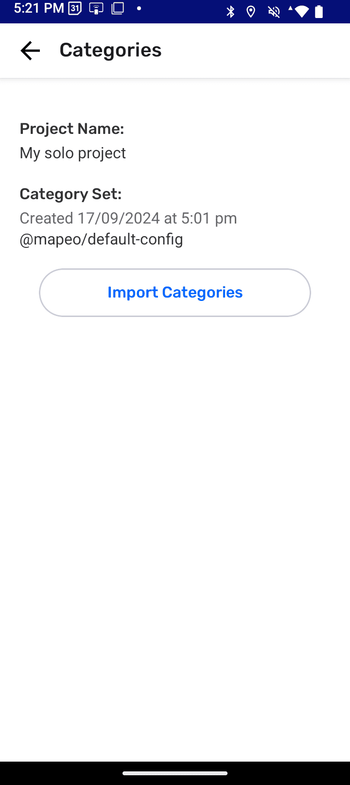 Step 5: Find the category set file (.comapeocat) and select it. CoMapeo will attempt import the file selected. If successful, information on the Catergories screen will be updated